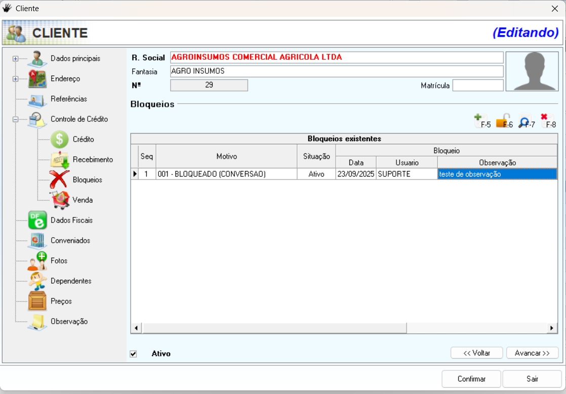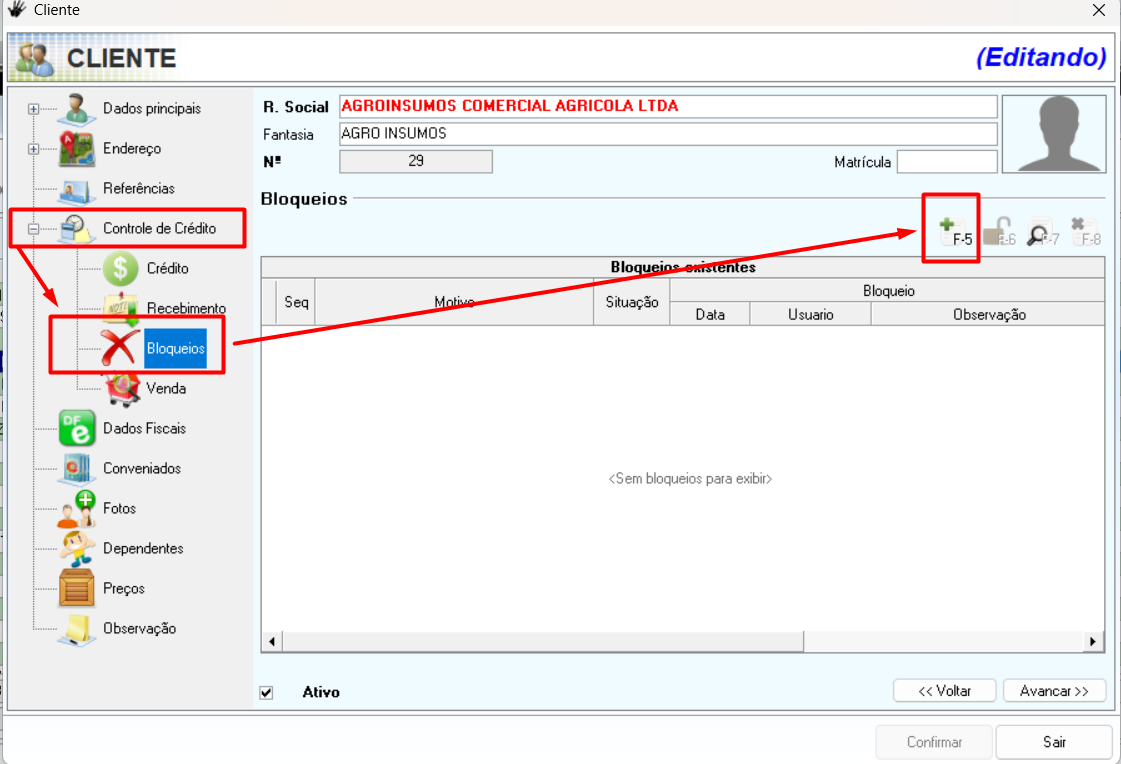 Na tela de cadastro do cliente, siga o caminho: Controle de Crédito → Bloqueios → F5
