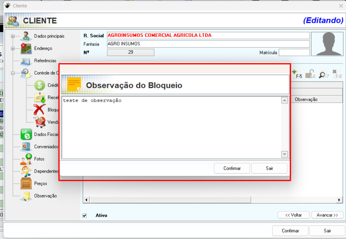 3. O bloqueio será adicionado ao cadastro do cliente:
