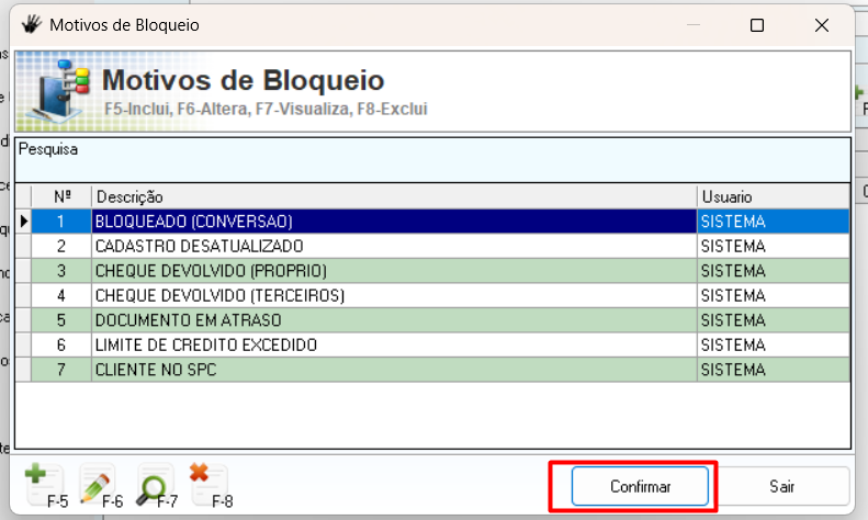 - F6 – Editar observação do bloqueio selecionado
