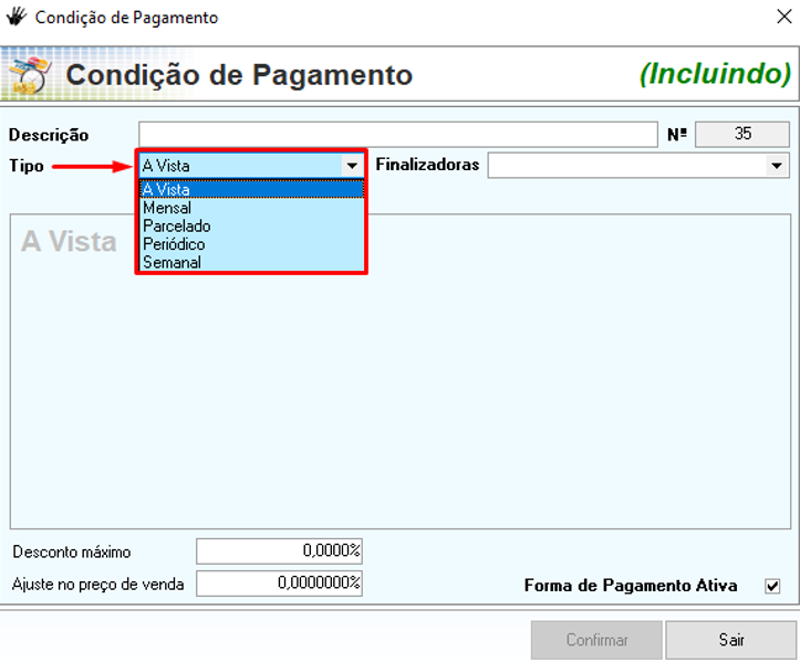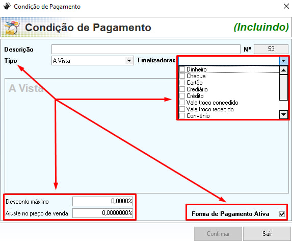 De acordo com o tipo da condição de pagamento é necessário selecionar também as finalizadoras usada e tem a opção de configurar um percentual máximo de desconto ou acréscimo.