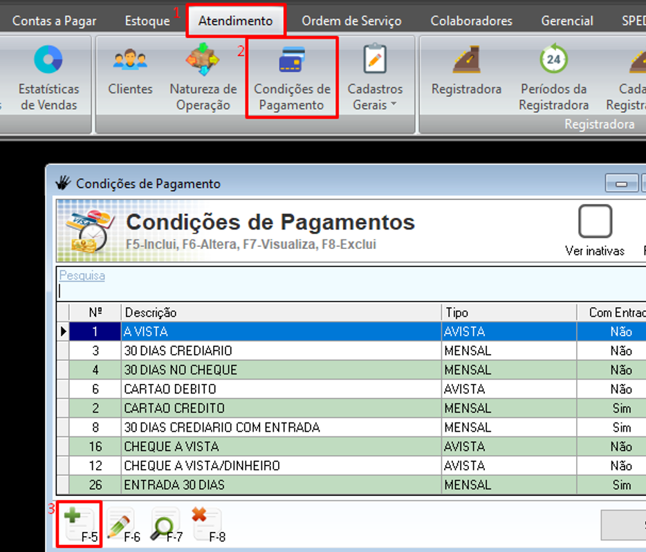 Na tela de atendimento → condição de pagamento → você clica em F5, para criar uma condição de pagamento.
