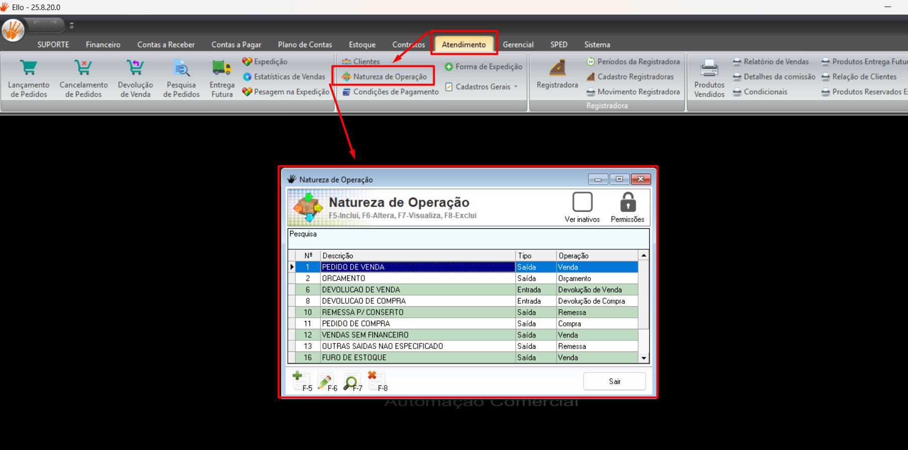 Para configurar acesse o menu Atendimento → Natureza de Operação.
