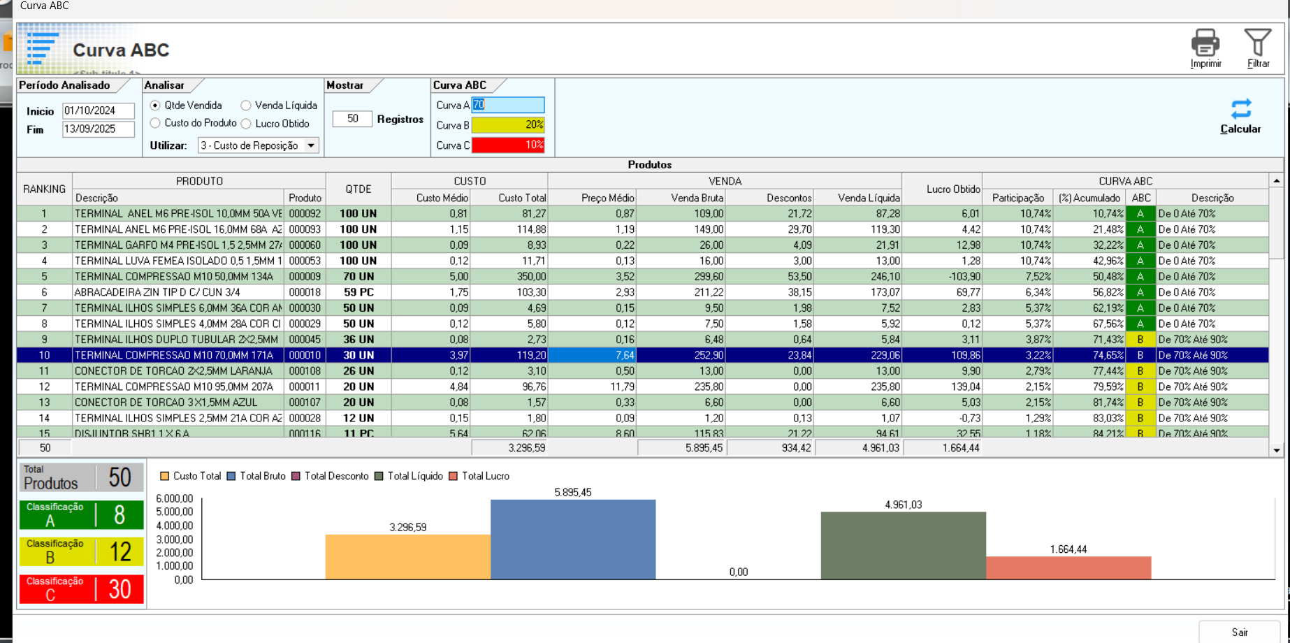 A tela da Curva ABC no sistema permite analisar os produtos por período, aplicando filtros conforme necessário.