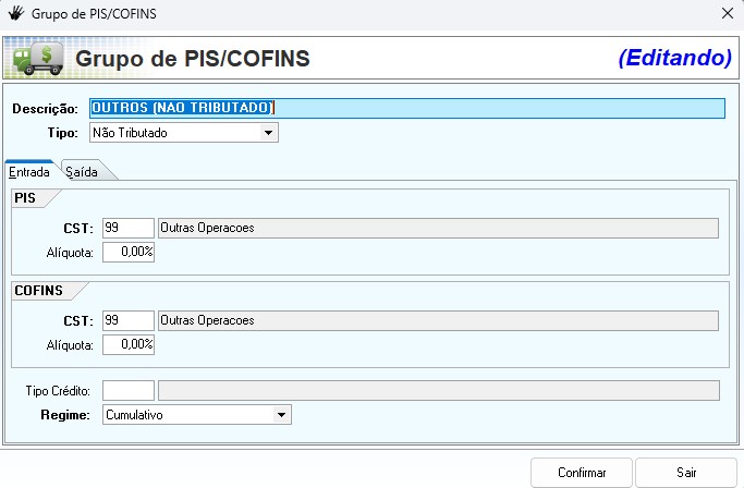 Na nota de entrada foi adicionado os campos Base de calculo, alíquota, valor e CST de PIS/COFINS