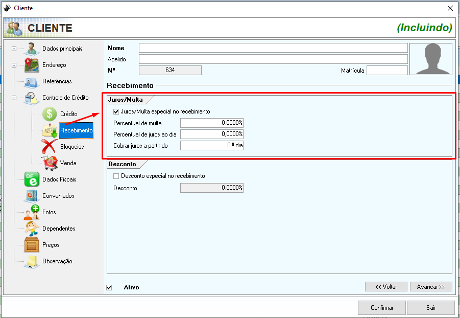 Marcando a opção “Juros/Multa especial no recebimento” será possível personalizar os valores de juros e multa para esse cliente.