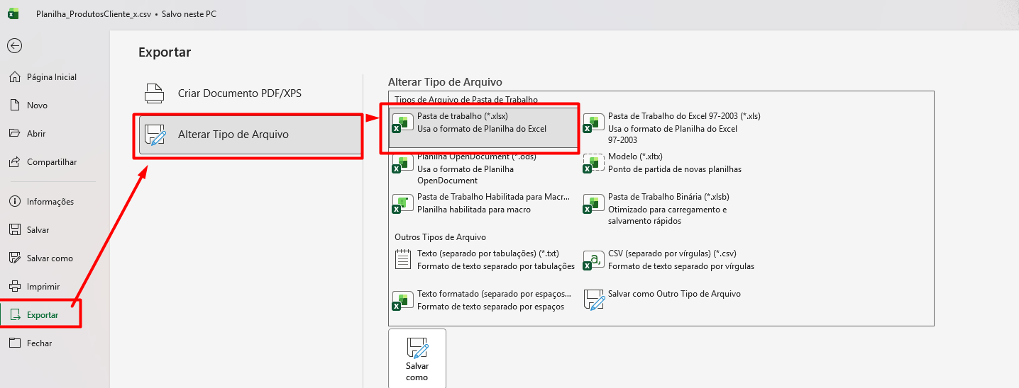 Após exportar o arquivo no formato CSV, é necessário convertê-lo para o formato .XLSX, pois é o formato mais utilizado pelas contabilidades.