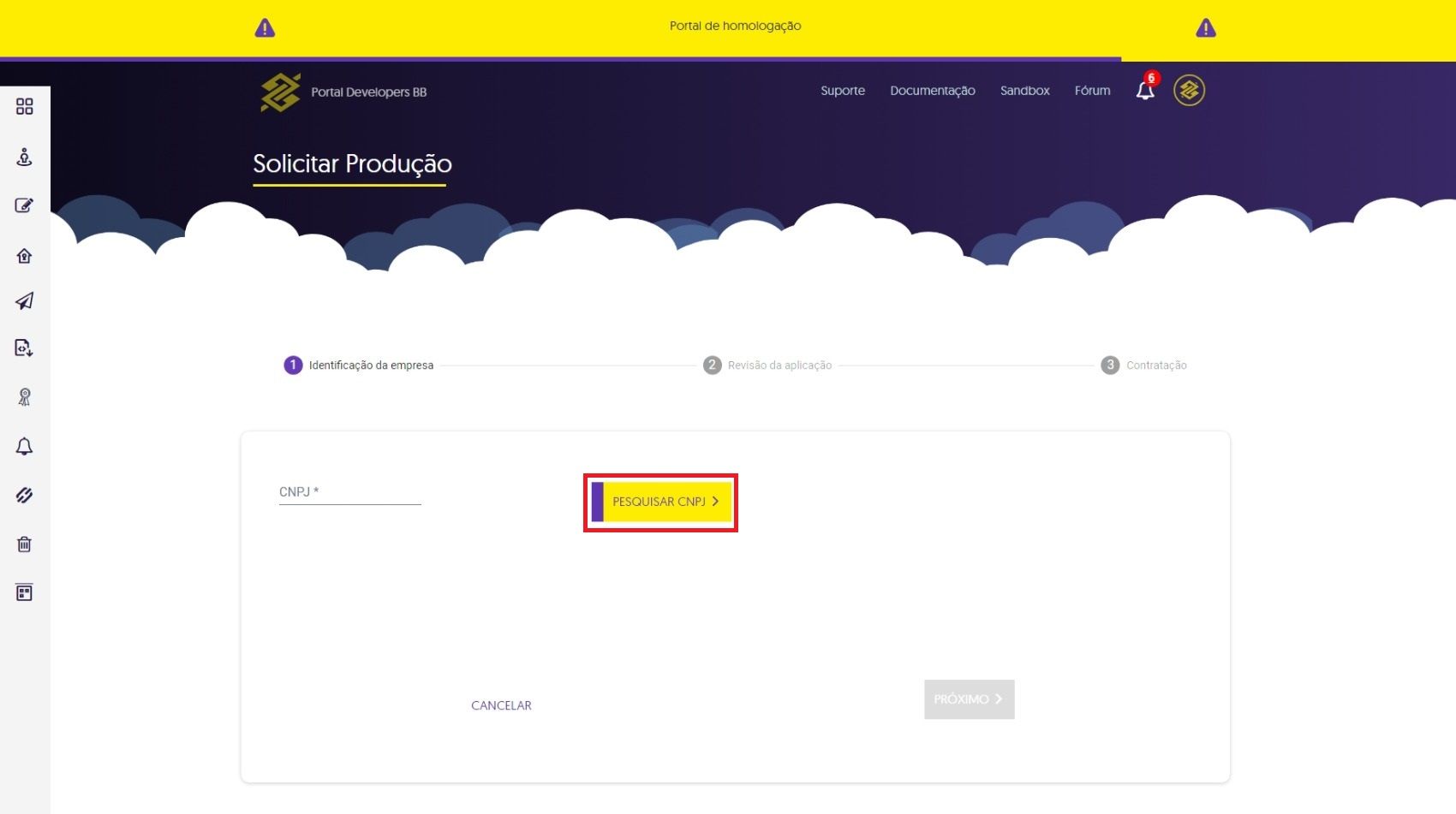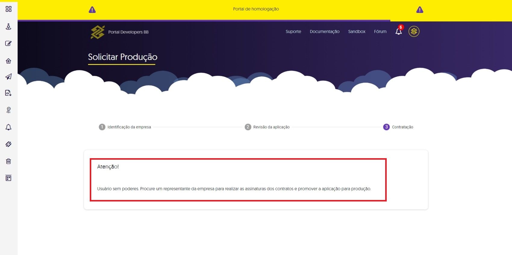 Após a solicitação do envio da aplicação para produção, será exibido uma mensagem de alerta: