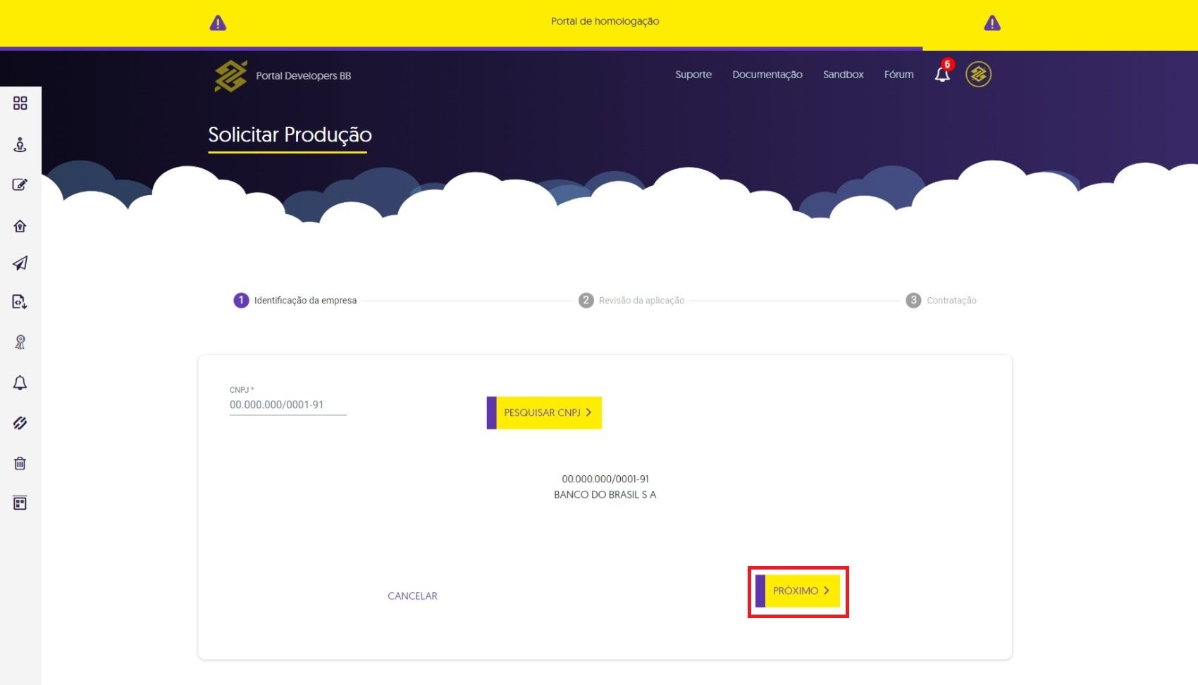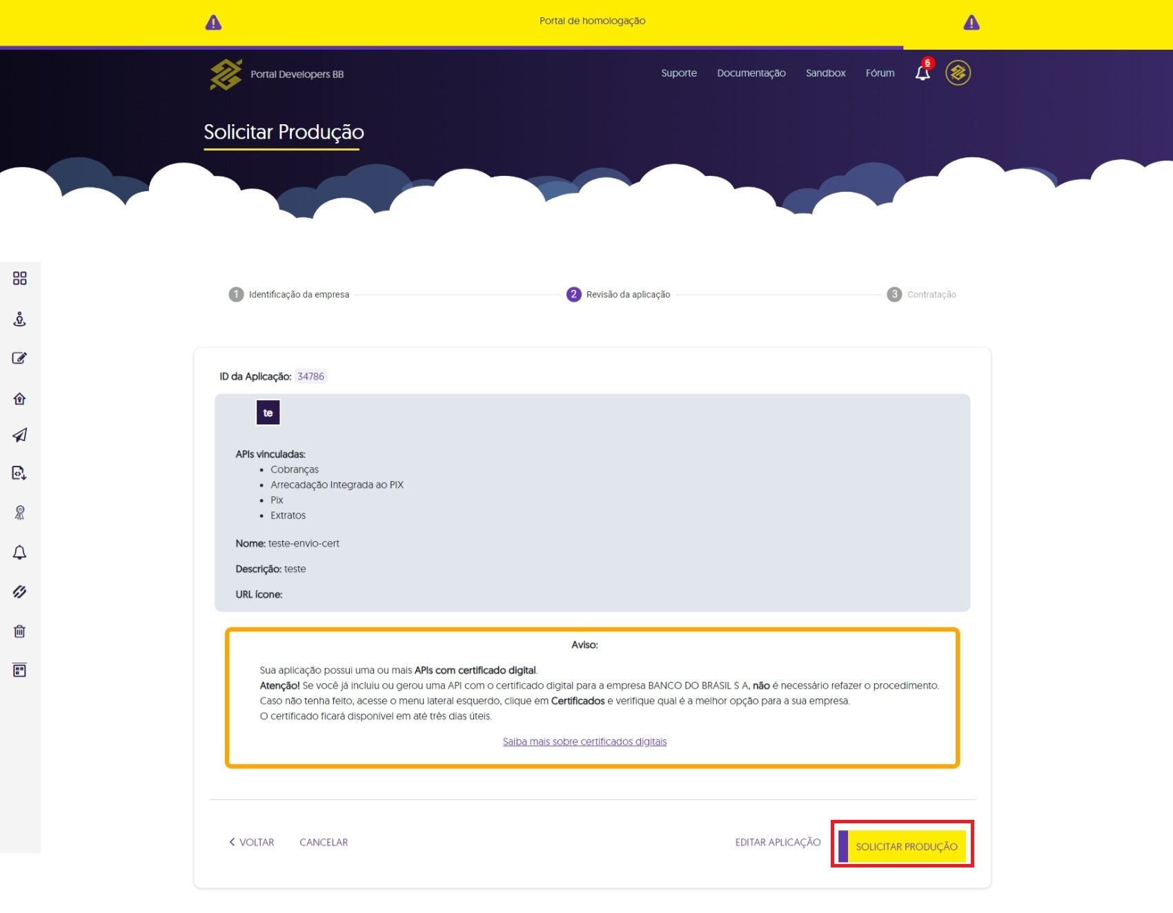Passo 4 - Revise os dados de sua aplicação, e clique no botão “Solicitar produção”