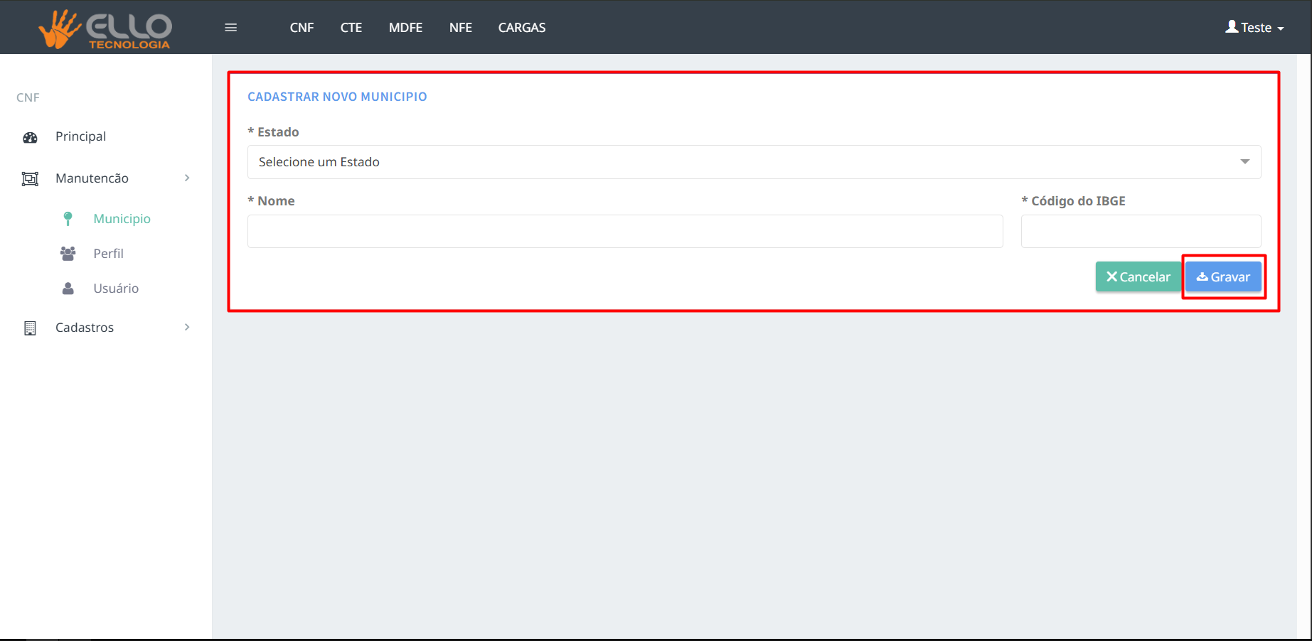 Após preencher as informações, clique no botão Gravar para concluir o cadastro. O município será registrado no sistema imediatamente.